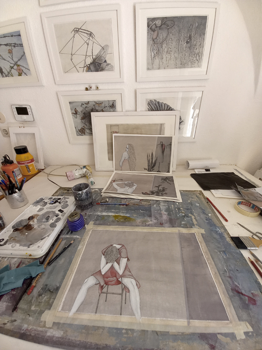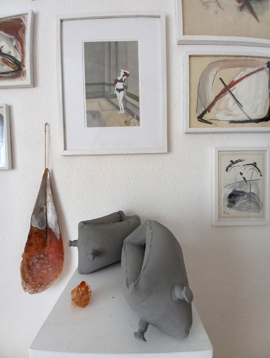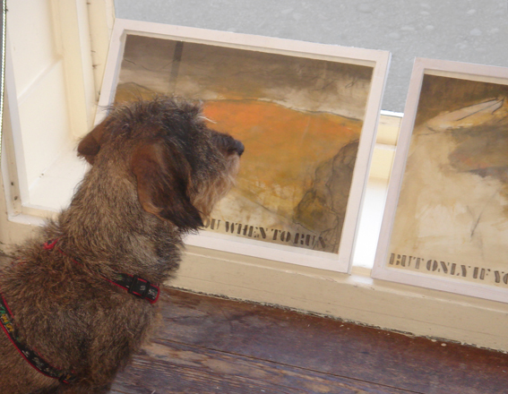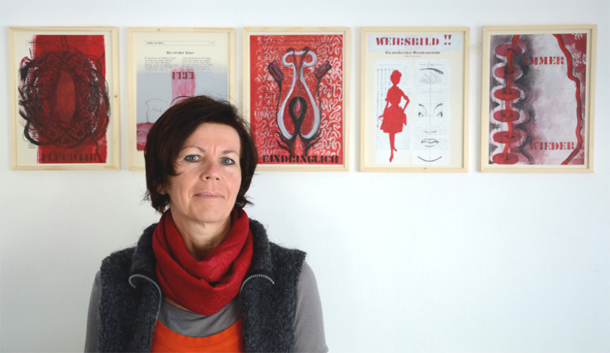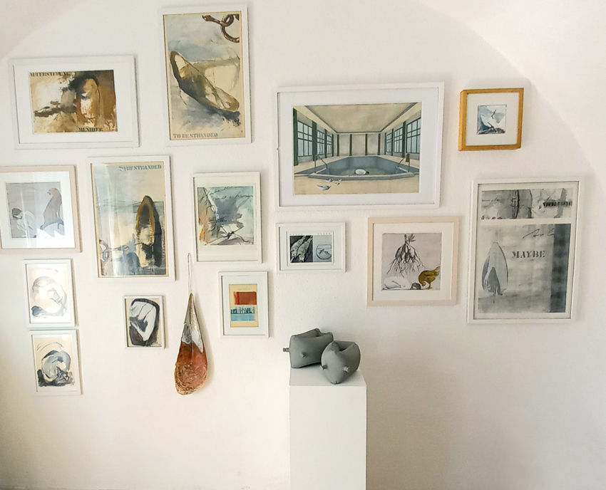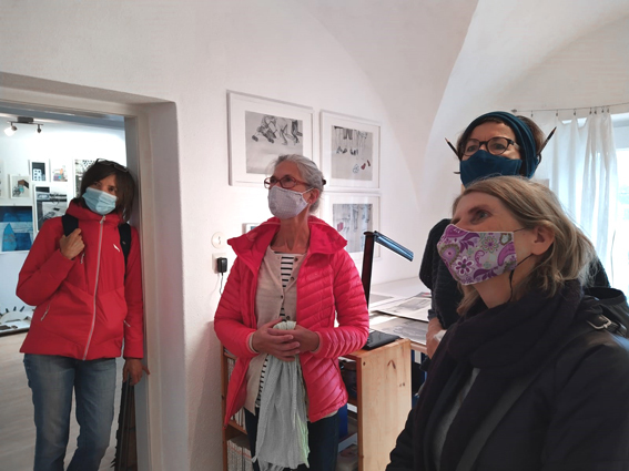 Bild unten: Besucher der Tage des offenen Ateliers 2020, coronabedingt mit Mund Nasen Schutz beim Betrachten der neuen Werkserie "Der Rand der Wörter" inspiriert von einem Text von Peter Handke